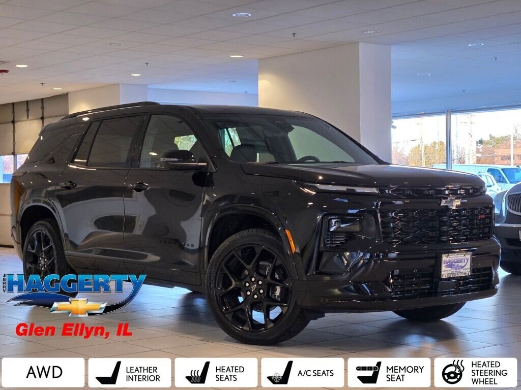 Mosaic Black Metallic 2026 Chevrolet Traverse RS AWD 8-Speed Automatic 2.5L DOHC AWD.Recent Arrival!For Value and Integrity, it has to be Haggerty! This Vehicle Features AWD, 12 Speakers, 3rd row seats: split-bench, 4-Wheel Disc Brakes, 6-Way Power Front Passenger Seat Adjuster, 8-Way Power Driver Seat Adjuster, ABS brakes, Air Conditioning, Alloy wheels, AM/FM radio: SiriusXM with 360L, Apple CarPlay/Android Auto, Auto High-beam Headlights, Auto tilt-away steering wheel, Auto-dimming door mirrors, Automatic temperature control, Bose Premium 12-Speaker Audio System Feature, Brake assist, Bumpers: body-color, Child-Seat-Sensing Airbag, Compass, Delay-off headlights, Driver 4-Way Power Lumbar Seat Adjuster, Driver door bin, Driver vanity mirror, Dual front impact airbags, Dual front side impact airbags, Electronic Stability Control, Emergency communication system: OnStar, Exterior Parking Camera Rear, Four wheel independent suspension, Front anti-roll bar, Front Bucket Seats, Front Center Armrest, Front dual zone A/C, Front Passenger 4-Way Power Lumbar Seat Adjuster, Front reading lights, Fully automatic headlights, Garage door transmitter, Heated door mirrors, Heated Driver and Front Passenger Seats, Heated front seats, Heated rear seats, Heated steering wheel, Illuminated entry, Low tire pressure warning, Memory seat, Navigation System, Occupant sensing airbag, Outside temperature display, Overhead airbag, Overhead console, Panic alarm, Passenger door bin, Passenger vanity mirror, Perforated Leather-Appointed Seat Trim, Power door mirrors, Power driver seat, Power Liftgate, Power passenger seat, Power steering, Power windows, Radio data system, Radio: : Audio System w/17.7 Diagonal Display, Rain sensing wipers, Rear air conditioning, Rear anti-roll bar, Rear reading lights, Rear window defroster, Rear window wiper, Remote keyless entry, Security system, SiriusXM with 360L Trial Subscription, Speed control, Speed-sensing steering, Spoiler, Sport steering wheel, Steering wheel memory, Steering wheel mounted audio controls, Tachometer, Telescoping steering wheel, Tilt steering wheel, Traction control, Trip computer, Turn signal indicator mirrors, Variably intermittent wipers, Ventilated Driver and Front Passenger Seats, Ventilated front seats, Voltmeter, and Wheels: 22 High Gloss Black Painted Aluminum.