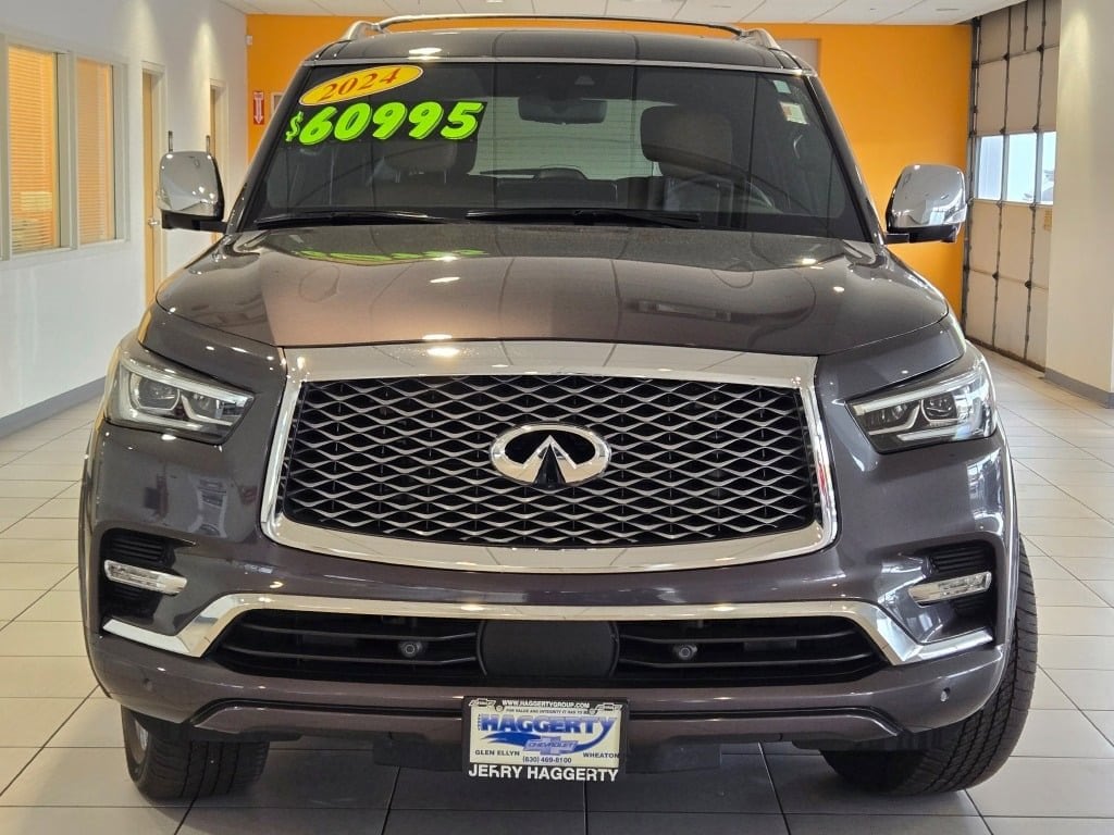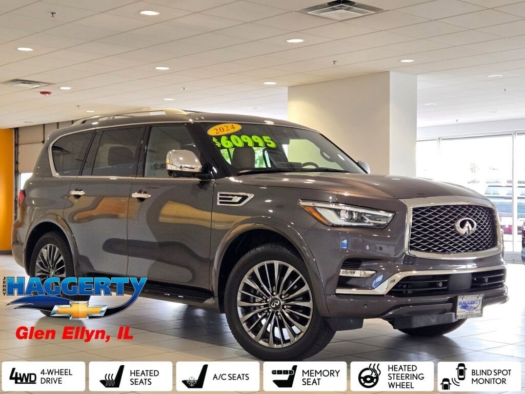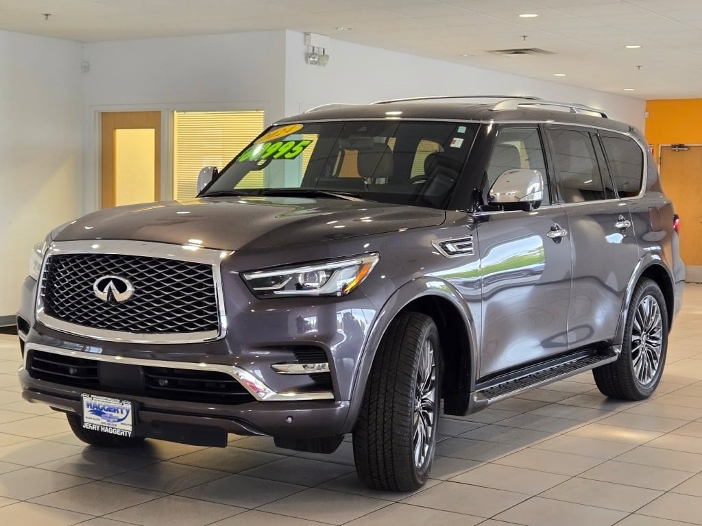 For Value and Integrity, it has to be Haggerty! This Vehicle Features Cargo Package (Console Net, First-Aid Kit, Moisture-Resistant Rear Cargo Carpet, and Nylon-Cord Cargo Net), QX80 Sensory, 4D Sport Utility, 5.6L V8, 7-Speed Automatic, 4WD, Anthracite Gray, Saddle Brown Leather, 17 Speakers, 2.937 Axle Ratio, 3rd row seats: bench, 4-Wheel Disc Brakes, ABS brakes, Air Conditioning, Alloy wheels, AM/FM radio: SiriusXM, Anti-whiplash front head restraints, Apple CarPlay/Android Auto, Auto High-beam Headlights, Auto tilt-away steering wheel, Auto-dimming door mirrors, Auto-dimming Rear-View mirror, Auto-leveling suspension, Automatic temperature control, Brake assist, Bumpers: body-color, Climate Controlled Front Bucket Seats, Compass, Delay-off headlights, Driver door bin, Driver vanity mirror, Dual front impact airbags, Dual front side impact airbags, Electronic Stability Control, Emergency communication system: INFINITI InTouch, Four wheel independent suspension, Front anti-roll bar, Front Bucket Seats, Front Center Armrest, Front dual zone A/C, Front fog lights, Front reading lights, Fully automatic headlights, Garage door transmitter: HomeLink, Heated door mirrors, Heated front seats, Heated rear seats, Heated steering wheel, Illuminated entry, Leather Shift Knob, Leather steering wheel, Literature Kit, Low tire pressure warning, Memory seat, Navigation system: INFINITI InTouch Navigation, Occupant sensing airbag, Outside temperature display, Overhead airbag, Overhead console, Panic alarm, Passenger door bin, Passenger vanity mirror, Perforated Semi-Aniline Leather-Appoi