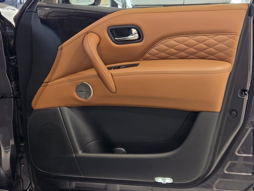 QX80 Sensory, 4D Sport Utility, 5.6L V8, 7-Speed Automatic, 4WD, Anthracite Gray, Saddle Brown Leather, 17 Speakers, 2.937 Axle Ratio, 3rd row seats: bench, 4-Wheel Disc Brakes, ABS brakes, Air Conditioning, Alloy wheels, AM/FM radio: SiriusXM, Anti-whiplash front head restraints, Apple CarPlay/Android Auto, Auto High-beam Headlights, Auto tilt-away steering wheel, Auto-dimming door mirrors, Auto-dimming Rear-View mirror, Auto-leveling suspension, Automatic temperature control, Brake assist, Bumpers: body-color, Cargo Package, Climate Controlled Front Bucket Seats, Compass, Console Net, Delay-off headlights, Driver door bin, Driver vanity mirror, Dual front impact airbags, Dual front side impact airbags, Electronic Stability Control, Emergency communication system: INFINITI InTouch, First-Aid Kit, Four wheel independent suspension, Front anti-roll bar, Front Bucket Seats, Front Center Armrest, Front dual zone A/C, Front fog lights, Front reading lights, Fully automatic headlights, Garage door transmitter: HomeLink, Heated door mirrors, Heated front seats, Heated rear seats, Heated steering wheel, Illuminated entry, Leather Shift Knob, Leather steering wheel, Literature Kit, Low tire pressure warning, Memory seat, Moisture-Resistant Rear Cargo Carpet, Navigation system: INFINITI InTouch Navigation, Nylon-Cord Cargo Net, Occupant sensing airbag, Outside temperature display, Overhead airbag, Overhead console, Panic alarm, Passenger door bin, Passenger vanity mirror, Perforated Semi-Aniline Leather-Appointed Seats, Power door mirrors, Power driver seat, Power Liftgate, Power moonroof, Power passenger seat, Power steering, Power windows, Radio data system, Radio: Bose Performance Audio System w/17 Speakers, Rain sensing wipers, Rear air conditioning, Rear anti-roll bar, Rear reading lights, Rear seat center armrest, Rear window defroster, Rear window wiper, Reclining 3rd row seat, Remote keyless entry, Roof Rail Cross Bars, Security system, Speed control, Speed-sensing steering, Split folding rear seat, Spoiler, Steering wheel memory, Steering wheel mounted audio controls, Tachometer, Telescoping steering wheel, Tilt steering wheel, Traction control, Trip computer, Turn signal indicator mirrors, Variably intermittent wipers, Ventilated front seats, Voltmeter, Wheels: 22 Dark Chrome Cast Aluminum-Alloy.